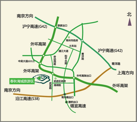 1、沿江高速—常州南出口—常武路—延政路岔路口—中国春秋淹城旅游区