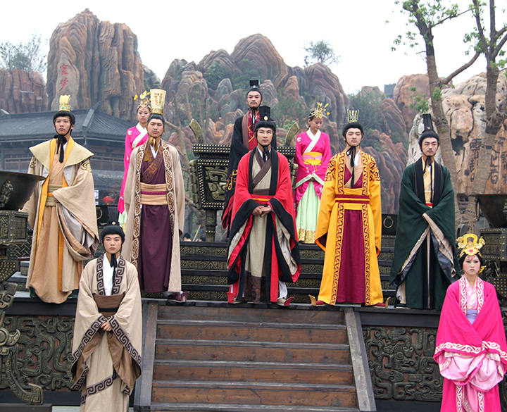 古人信奉天神、地祇、鬼魂。祭祀是华夏礼仪最重要的部分,祭台是完成典礼,求福的庄严圣地。祭台中心摆放的叫鼎。鼎原本是古代的烹饪器具,后来成为一种重要祭祀礼器,象征权力和地位。传说大禹建立夏朝,用天下金铸成九鼎,象征九州。因此有九鼎之尊、问鼎中原的说法。在这里每天上午9点18分都会举行盛大的春秋祈福表演《祈福大典》。《祈福大典》取材于春秋时期君王祭神祈福的传说,用现代艺术表现手法,再现古淹国阅兵、祈福、歌舞、结盟的历史场景。由此展示当今“和谐社会、共同繁荣”的主题。场面宏大,气势磅礴,音乐震撼而凝重,舞武相融,古朴而新奇,加之现代卡通形象的串场,让您在感受春秋文化的同时,又能充分享受现代时尚的乐趣。